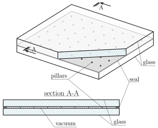 The subject of this work is VIG (Vacuum Insulating Glass) panels. They represent the latest technological achievement that is already implemented in many countries. The VIG technology consists of two high-strength glass panes with a vacuum between them (Figure 1). In order to counteract the atmospheric pressure and the contact of the panels, they are connected to micro-support pillars—elements usually made of steel with a diameter of 0.3–0.5 mm [1]. Moreover, the panes are sealed around the edges. Consequently, this design provides excellent thermal properties to VIG panels. Their U-value can be as low as 0.2–0.4 W/m2K [2].