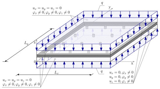 The main issue in selecting the geometry and support conditions was the need to enable compatibility between all analysed modelling methods, which differ significantly in their approach. Only by providing the same support conditions obtained results were comparable to each other. Ultimately, simple support conditions were assumed on all edges of the plate (i.e., all displacements were blocked and all rotations were released at all nodes—Figure 2).