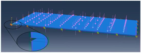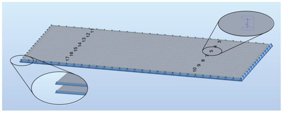 In the case of the three-dimensional FEM model, the displacements were blocked only in the internal panes of both plates (Figure 3). In the case of blocking the displacements along the entire thickness of the glass elements, restraint would have appeared on a given edge [17].