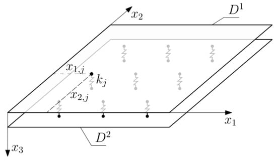 The analytical model included in this study was based on the assumptions made in [18]. Let Ox1x2x3 be an orthogonal Cartesian coordinate system. Two plates of thicknesses hi, i = 1, 2 made of the same material (density ρ, Young’s modulus E and Poisson number ν) were considered. There are n springs, each of stiffness kj, located in points with coordinates are located between those plates (Figure 6).