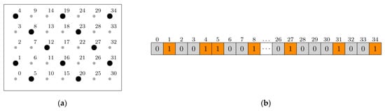 Example of chromosome coding: (a) schematic plate with pillars (black point—pillar occurs, grey point—pillar lacking), (b) part of chromosome representing an individual plate.