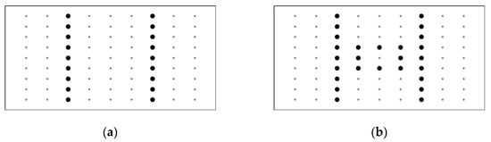 Applied pillars arrangement in two calculation examples: (a) case number 0375, (b) case number 0375X. Grey dots stand for the lack of the pillars and black stand for pillars.