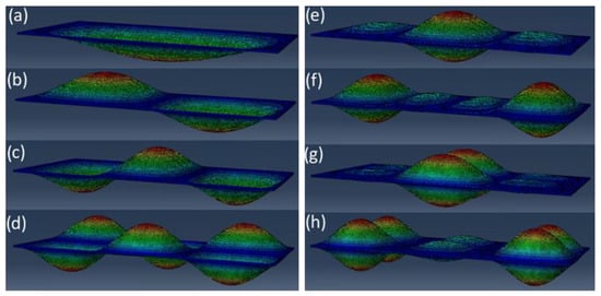 When comparing the values of individual frequencies of natural vibrations, the modes of natural vibrations obtained in all models were analysed. They can be divided into two groups: vibrations in phase and vibrations in counter-phase. In the former case, both plates swing in the same direction at the same time (Figure 10a–d), in the latter case, plates swing in the opposite direction (Figure 10e–h).