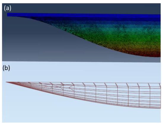 Fragment of the first z-normalized wane mode of natural vibrations for case 0375 in two calculation models (a) 3D FEM model; (b) simple FEM model.