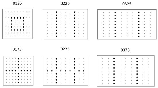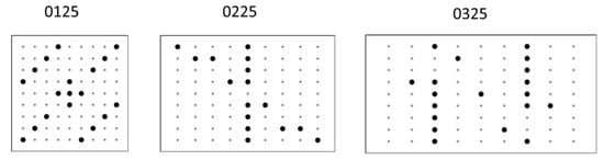 In the case of using the fractal objective function defined by the Formula (23), the optimal solutions become more complicated. It is clear that trivial solutions are rejected. In the case of a square plate (0125), it is characterized by quasi-rotational symmetry with 90° angle. However, in the case of rectangular plates (0225 and 0325) the evolution of forms in relation to those shown in Figure 13 towards more differentiated solutions, but with the preservation of some areas of a linear arrangement of pillars.