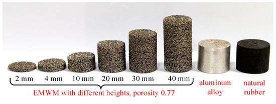 In addition to the EMWM specimens mentioned above, for comparison purposes, cylindrical samples with a diameter of 20 mm and a height of 20 mm are prepared using aluminum alloy (grade 2A12) and natural rubber.