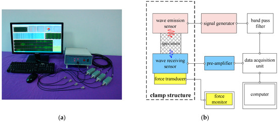 (a) Acoustic emission equipment used in the work; (b) schematic diagram of the experimental setup.