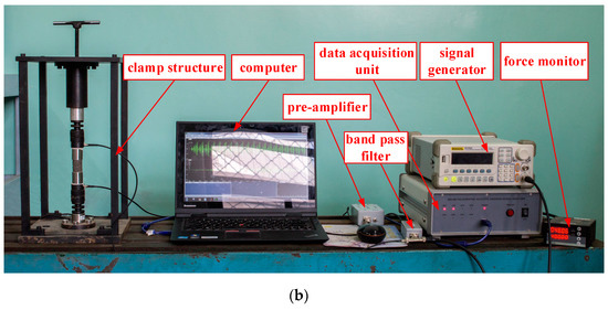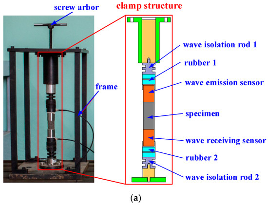 A clamping structure adjusting the pre-compression force of the specimen is designed in this work, as shown in Figure 4. The components of the clamping structure from top to bottom are as follows: compression screw, pressure rod, isolation rod 1, isolation rubber 1, wave emission sensor, specimen, wave receiving sensor, isolation rubber 2, isolation rod 2, and force transducer. Two acoustic emission sensors are placed in close proximity to the ends of the specimen. One sensor serves as the wave emission sensor and is connected to the signal generator, while the other sensor serves as the wave receiving sensor and is connected to the data acquisition unit via a signal amplifier. When adjusting the pre-compression force, the screw is tightened to move the pressure rod downward. The compression force is transmitted through the isolation rod 1, isolation rubber 1, and the wave emission sensor onto the specimen. The magnitude of the pre-compression force is measured by the force transducer. In the experiment, pre-compression forces of 50 N, 100 N, 150 N, 200 N, 250 N, and 300 N are applied to the specimen. To prevent multiple reflections of waves within the clamping structure from interfering with the experimental results, multiple layers of isolation rubbers and isolation rods with section geometry variations are designed. This arrangement can effectively isolate interference waves.