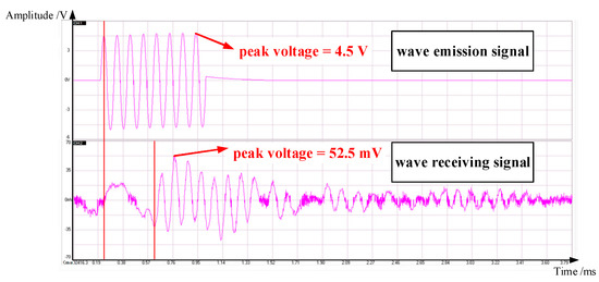 In the experiment, the emission wave is an 8-wavelength sinusoidal signal. The frequency of the emission wave is determined based on the experimental frequency, ranging from 0 to 20 kHz, and remains the same with each emission. It is transmitted every 100 ms, and the receiving end detected the transmitted wave with a certain time delay. The received signal largely preserves the waveform of the emission signal. An example of the time-domain signal for one typical emission and reception is shown in Figure 5. In order to account for the varying amplitude of the receiving waves, this work defines the average voltage amplitude of the receiving waves (each parameter combination tested three times) by extracting the peak values of the first four complete waveforms and taking their average . Following the same rules, the average voltage amplitude of the emission waves is calculated. Due to the excellent reproducibility of the experimental data, no data was discarded.