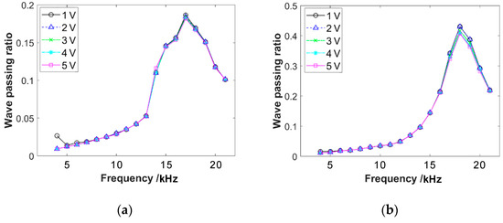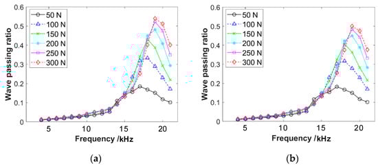 With input voltages of 2 V and 5 V, respectively, different pre-compressive forces are applied to the acoustic emission sensors and the frequency response curves are obtained, as shown in Figure 7. It can be observed that the peak of wave passing ratios increases with the increase in pre-compressive force. Additionally, the single peak shifts towards higher frequencies. This result will also affect the measurement of the response of wave propagation through the specimen corresponding to different pre-compressive forces.