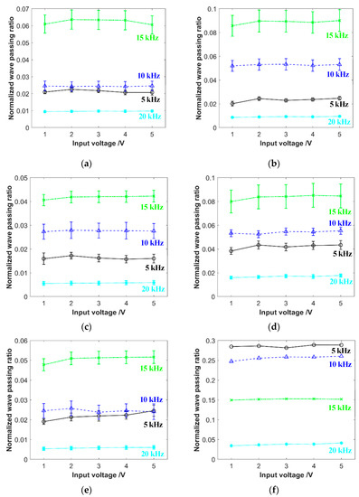The results of the wave passing ratio for some certain specimens under different input voltages, excitation frequencies, and pre-compression forces are shown in Figure 8. The calculated fluctuation amplitude of the wave passing ratios for the EMWM specimens is found to be less than 15%. The response does not exhibit a monotonic behavior with increasing voltage. Therefore, it can be concluded that the fluctuation in the response is within the range of experimental error. This result indicates that the wave propagation characteristics of the EMWM exhibit good linearity, which means that the wave passing ratio is independent of the excitation amplitude.
