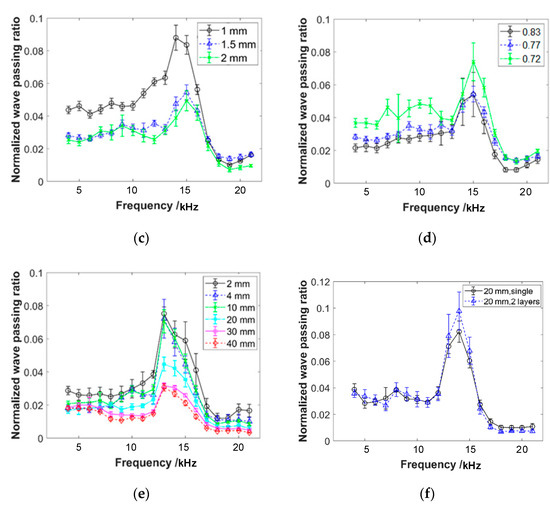 The experiment applies wave excitation to specimens with different pre-compression forces, porosity, wire diameter, helix diameter, specimen height, and layered structures. The frequency response curves of the wave passing ratio are shown in Figure 9. The vertical axis of the curve represents the normalized wave passing ratio, while the horizontal axis represents the frequency of the emission wave. The experimental frequency range starts from 4 kHz and ends at 21 kHz, with an increment of 1 kHz. Based on the experimental results shown in the figures, the following conclusions can be drawn: