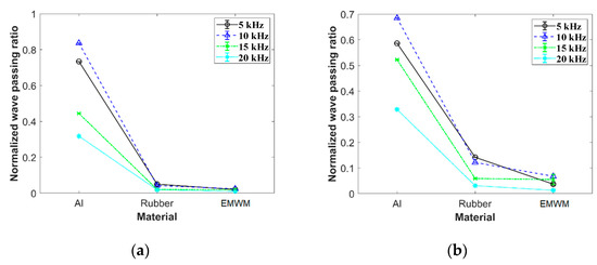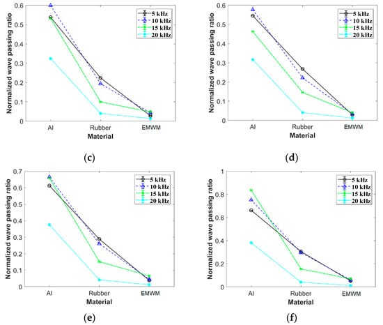 Comparison with wave passing ratio of different materials, with the pre-compression force of (a) 50 N, (b) 100 N, (c) 150 N, (d) 200 N, (e) 250 N, and (f) 300 N.