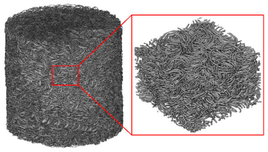 For a further understanding of the experimental results, this work utilizes CT scanning and skeleton extraction algorithms to establish the spatial structure of the EMWM specimens, as shown in Figure 11. Firstly, the CT scanning images are reconstructed using the commercial software Avizo v9.0, resulting in a three-dimensional model composed of voxels. Then, the skeleton algorithm is employed to binarize the chromaticity of the three-dimensional model, distinguishing between the wires and gaps. Thereby, both the solid model and the skeleton (the central axis of the wire spirals) are obtained. Then, the skeleton model is imported into Matlab, where the keypoints and nodes of the skeleton are identified for finite element mesh generation. According to the experimental results mentioned in Section 4.1, that the wave passing ratio is not significantly affected by the load amplitude, the contact points between the wires in the skeleton model are merged and set as a shared keypoint, as shown in Figure 12. Finally, the processed skeleton model is imported into the finite element software ANSYS v17.0. The model is divided with two-node BEAM188 beam elements.