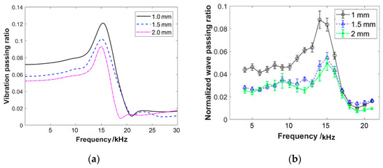 Comparison of wave passing ratio of EMWMs with different helix diameters: (a) simulation results and (b) experimental results.