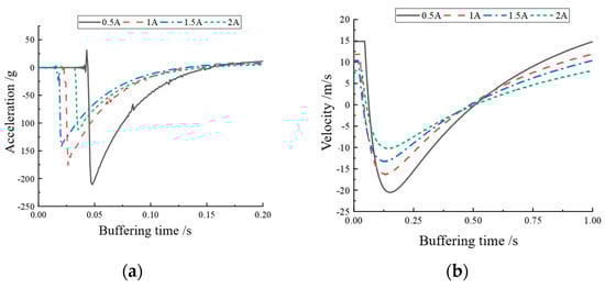 From Figure 13a, it can be seen that the response acceleration value gradually became smaller when the current increased, indicating that the vibration caused by the shock was gradually absorbed by the MR buffer as the current increased. The current curves in the figure had different starting points due to errors in the response capability of the MR buffer and the accuracy of the sensor, but this did not affect the analysis of the buffer performance. Figure 13b,c show the velocity versus time and displacement versus time for impacting the top-end cap, both obtained by integrating the acceleration variation graph. From Figure 13b,c, it can be seen that the amplitude of velocity and displacement change decreased with the increase in current, which proves that the designed MR buffer was effective in response to the shock, the designed magnetic circuit was correct, and the buffer damping force could be enhanced with the increase in current.
