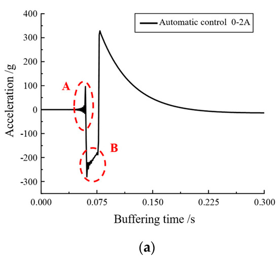 The designed voltage–current continuous variation signal was input into the magnetorheological buffer and a drop hammer impact experiment was conducted to record the variation curves of acceleration, velocity, displacement, and buffer damping force in order to analyze the effect of its variable current control and, thus, judge the feasibility of optimal buffer control. Figure 22 show the acceleration variation of the MR buffer and the local enlargement of the A and B regions when the current was automatically adjusted.