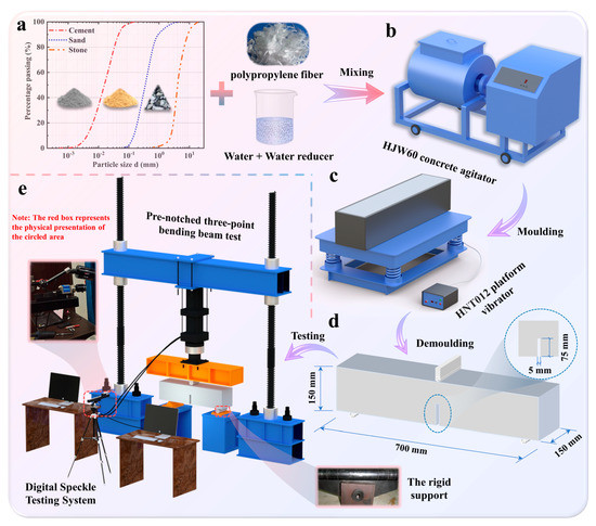 Specimen production and testing process: (a) raw materials and gradation curves; (b) concrete agitator; (c) platform vibrator; (d) specimen geometry and performance parameters; (e) the pre-notched three-point bending beam test monitored by the digital speckle correlation method.