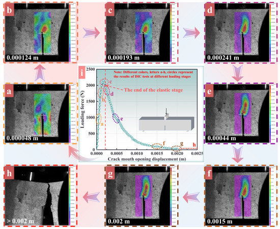 (a–h) The strain distribution contour under CMOD values in pre-notched three-point bending beam test for plain concrete; (i) the p-CMOD of the pre-notched three-point bending beam test.