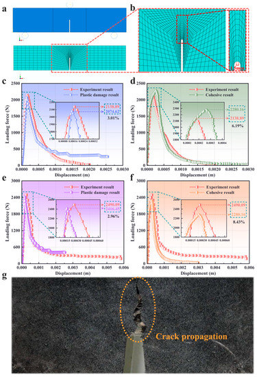 Comparison of simulation and experimental results: (a) the finite element model and mesh pattern of pre-notched three-point bending beam; (b) the details of the mesh in the vicinity of the notch apex (The red box represents a partial enlargement of the area); (c,d) numerical and experimental p-CMOD curves in pre-notched three point bending beams of plain concrete: (c) plastic damage model; (d) cohesive model; (e,f) numerical and experimental p-CMOD curves of the pre-notched three point bending beams of PFRC: (e) plastic damage model; (f) cohesive model; (g) the pattern of the fracture surface.