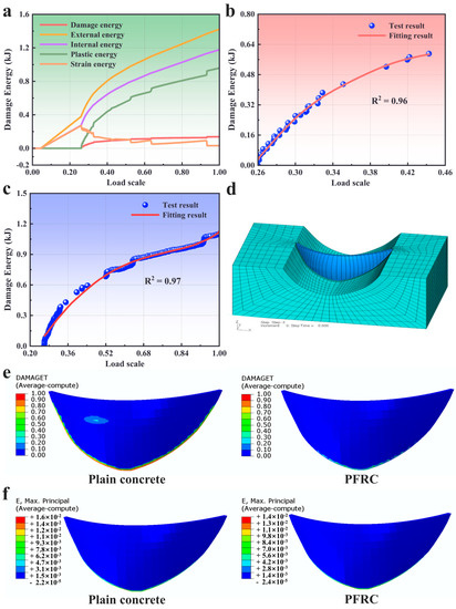 Various kinds of energy evolution curves including damage energy, external energy, internal energy and plastic energy are plotted in Figure 5a for the plain concrete three-point bending beam. The entire curves can be divided into two main stages as the elastic stage and nonelastic stage. The demarcation point can be assumed as 30% of the total loading process, in which the damage just appears in front of the crack tip corresponding to Figure 4a. Before the demarcation point, the external energy value is always greater than that of the internal energy due to the loss of energy absorbed by the supports, and the plastic energy and damage energy are 0. In particular, the entire beam performs as a conservative system and the internal energy is stored as strain energy. After the loading scale exceeded the demarcation point, the damage energy and plastic energy appeared synchronously, and the internal energy was still increasing. By contrast, the strain energy tended to drop remarkably. These phenomena illustrate that the permanent deformations induced by the dissipation mechanism happened in the beam and some region of the beam was under the unloaded condition.