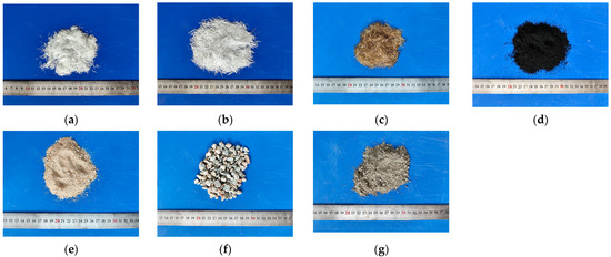 Raw materials of HFRRRC: (a) 6 mm GF; (b) 12 mm GF; (c) SF; (d) sand; (e) RR; (f) CA; (g) cement.