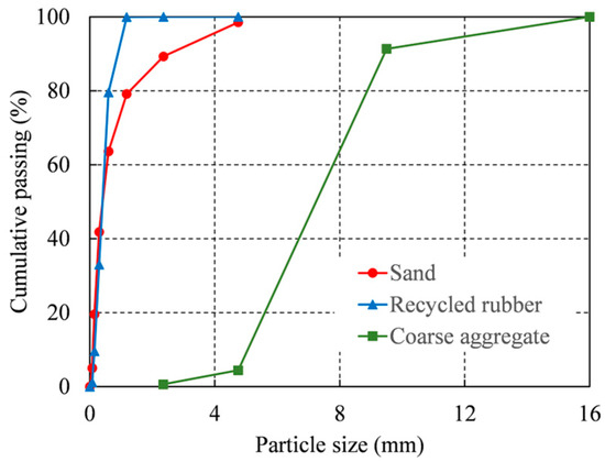 Cement, water, RR, sand, coarse aggregate, SFs, and GFs are combined to produce HFRRRC, as shown in Figure 1. Ordinary Portland cement with a strength grade of 42.5 MPa and a specific gravity of 3.11 was used. Tap water with a specific gravity of 1.00 was obtained from the laboratory. River sand with a maximum particle size of 5 mm and 20 mesh recycled rubber were used as fine aggregates (FAs) in this study. According to the standard GB/T 14684-2011 [30], the properties of the sand were obtained from the tests, as listed in Table 1. The properties of the recycled rubber were provided by Dujiangyan Huayi Rubber Co., Ltd., (Chengdu, China), and are listed in Table 1. The coarse aggregates (CAs) are selected from crushed granite, with a particle size range of 5–16 mm. According to the standard GB/T 14685-2011 [31], the properties of coarse aggregates were obtained from tests, as shown in Table 1. The particle size distribution of sand, recycled rubber, and coarse aggregates are shown in Figure 2. The SFs used in this study are straight and copper plated. The parameters of SFs are provided by the supplier Henan Zange Industrial Co., Ltd., (Zhengzhou, China), as shown in Table 2. Two varieties of alkali-resistant GFs with fiber lengths of 6 mm and 12 mm were employed in order to investigate the impact of GF length on the compressive behavior of RRC. The only difference between the two kinds of GFs is their length. The supplier Taishan Glass Fiber Co., Ltd., (Taian, China) provides the GFs’ qualities, which are displayed in Table 2. The superplasticizer (SP), which utilizes an admixture based on polycarboxylates, has a specific gravity of 1.02 and a solid content of 9%. The dosage of SP is 0.5% of the cement mass.
