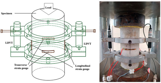 The settings for the axial compression tests are shown in Figure 3. Plaster was applied before loading to ensure the flatness and parallelism of the upper and lower surfaces of the specimen under compression. At the specimen’s mid-height, two 50 mm long longitudinal strain gauges were symmetrically adhered. Likewise, two symmetrically glued 50 mm long transverse strain gauges were attached to the specimen’s midpoint. Two linear variable differential transducers (LVDTs) were set up within an 80 mm length at the specimen’s mid-height to measure the axial strain because the strain gauges were destroyed after the concrete cracked. Based on the standard ASTM C39/C39M [33], the experimental loading adopted a displacement control mechanism with a loading rate of 0.18 mm/min. Before the formal loading, the specimen was preloaded and centered according to the readings of the strain and displacement gauges. The specimen was subjected to axial compression before it was subjected to formal loading. The load and deformation values during the loading process were recorded. The axial deformations of the specimens were measured using linear variable differential transformers and a longitudinal strain gauge. Similarly, a transverse strain gauge was used to quantify the specimens’ transverse deformations. Equations (1) and (2) may be used to compute the axial stress σ and strain ε of the specimens during the loading process based on the collected data.