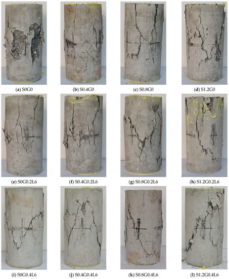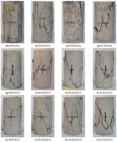 Additionally, when only the SFs were introduced at 1.2%, the greatest gain in compressive strength was 11%. Similar to this, adding merely 12 mm GFs at 0.6% increased compressive strength by a maximum of 8%. However, the largest gain in compressive strength for the 12 mm GFs at a content of 0.4% and SFs at a content of 1.2% occurred when both GFs and SFs were applied. Therefore, it can be said that GFs and SFs both increase the compressive strength of RRC when added independently. However, the largest compressive strength was achieved when GFs and SFs were added together. S1.2G0.4L12 had the highest compressive strength, and the corresponding single-fiber specimens were S1.2G0 and S0G0.4L12. The failure modes are shown in Figure 5d,u,x. This hybrid effect is caused by the distinct characteristics of the two types of fibers. Due to the high strength and elastic modulus of the SF, it can form a skeleton inside the concrete and provide bridging effects across cracks at the initial stages of cracking. The SFs were removed and failed when the cracks enlarged. In addition, after the addition of GFs with larger aspect ratios, more small cracks appeared when the concrete was damaged. This is because a large number of GFs can effectively reduce the degree of stress concentration at the crack tip and redistribute the stress inside the concrete. GFs allow more matrix materials to function, thereby improving the strength and toughness of RRC.