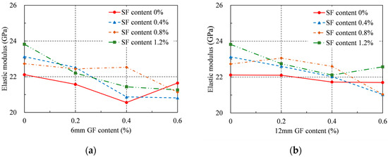 The elastic modulus of RRC was computed and shown in Table 4 and Figure 7 in accordance with ASTM C469/C469M [36]. As the GF content grew, the elastic modulus of each series decreased, which is similar to the conclusion in the literature [37]. For each series, the maximum elastic modulus occurred when the GF content was 0%, except for the series with 0.8% SFs. Specifically, for the series with 0.8% SFs, the elastic modulus growth rates were found to be very close; that is, 3, 1, and 2% when the 6 mm GF content was 0, 0.2%, and 0.4%, respectively. The elastic modulus increased by a maximum of 4% for the 0.8% SF series when the 12 mm GFs content was 0.2%. The addition of the GFs had a passive effect on the elastic modulus. However, an improvement was observed when SFs were added, particularly at concentrations of 0.8%.