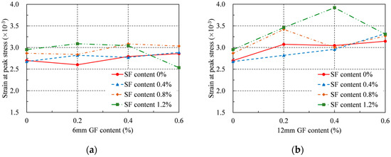Strain at peak stress: (a) 6 mm GF; (b) 12 mm GF.