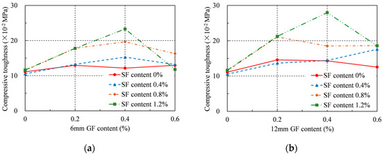 Compressive toughness: (a) 6 mm GF; (b) 12 mm GF.