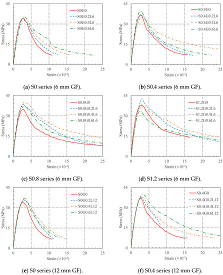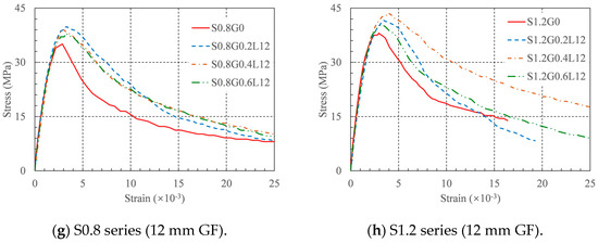 The strain at the peak stress is defined as the average longitudinal strain within the middle 80 mm range of a concrete specimen when it reaches compressive strength, as shown in Table 4 and Figure 9. The impact of the GF content on the strain at the peak stress differed for various RRC series. The strain at peak stress rose with an increase in the 6 mm GF content for the series without SFs, but it increased monotonically with an increase in the 12 mm GF content. When the GF content was 0.6%, both GF lengths produced the maximum increase in strain at peak stress. These values were 6% and 17% for the 6 mm and 12 mm GFs, respectively. For the series containing SFs, when the 6 mm GFs content was 0.2% and the SFs content was 1.2%, the maximum increase in strain at peak stress was roughly 14%, and when the 12 mm GFs content was 0.4% and the SFs content was 1.2%, the maximum increase in strain at peak stress was roughly 45%. Moreover, by comparing Figure 10a,b, it can be concluded that the 12 mm GFs had a more significant impact on the strain at peak stress.