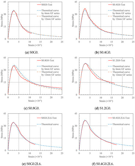 The stress–strain curves for each concrete mixture are shown in Figure 11. In Figure 11, it can be observed that all stress–strain curves can be divided into three stages: the linear rise (from the beginning of loading to 40% compressive strength), nonlinear rise (from the proportional limit point to the compressive strength), and decline (from the compressive strength to the failure point of the specimen). The stress–strain curve of RRC’s form and properties were significantly influenced by both the SFs and GFs. In the following sections, a constitutive relationship is established based on the experimental data to predict the stress–strain relationship of HFRRRC.