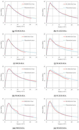 where fc is the compressive strength, εc is the strain at peak stress, and a and b are the controlling parameters. Equations (4) and (5) were used to fit the rising and descending segments of the stress–strain curve, respectively [38,39]. By fitting the test stress–strain curve, the values of the above two controlling parameters were obtained, as shown in the last two columns of Table 4. All the values of R2 were greater than 0.932. This indicates that the constitutive model can accurately predict the stress–strain curve of HFRRRC.