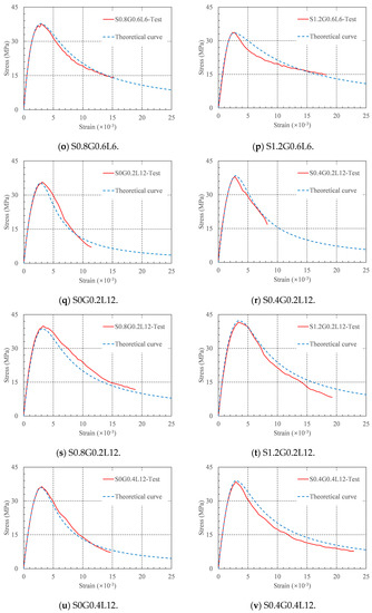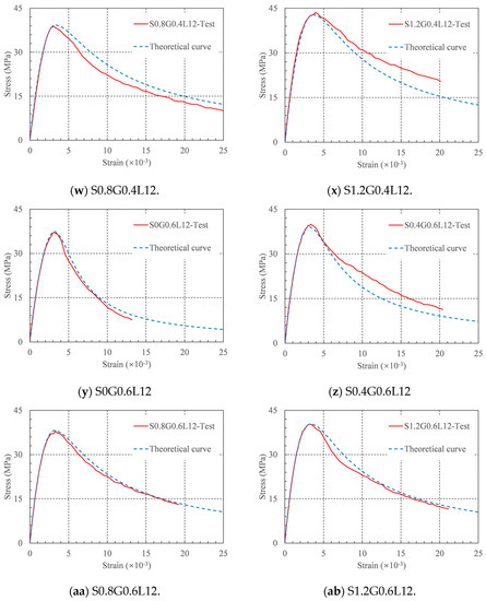 The coefficients in Table 5 can be used to construct the axial compressive stress–strain constitutive models of RRC with different fiber contents. The generated constitutive model and the experimental stress–strain curves are compared in Figure 12. Through comparison, it can be found that the theoretical curve is in good agreement with the experimental curve, indicating that the proposed constitutive model can accurately predict the stress–strain curve of HFRRRC. This is because the mechanism of how SFs and GFs affect the compressive behavior of RRC is complicated. In this study, the RI of the two types of fibers was fitted as a variable simultaneously, which led to a decline in the goodness of fit. A large amount of experimental research is required to fully investigate the failure mechanism and constitutive model of the HFRRRC. However, our investigation showed that Equations (4) and (5) may accurately forecast the stress–strain curve of this novel concrete. The suggested model can simultaneously forecast the stress–strain curve of HFRRRC with any fiber composition.