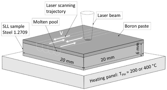 Fiber laser machine FANUCI® PRO 1500 (Fanuci, Gdansk, Poland) with a single module optical fiber laser source with a wavelength of 1070 nm was used for surface laser alloying. The main processing parameters were as follows: continuous laser emitting; laser power—300 W; laser spot diameter—1 mm; laser operating speed between 500 and 1500 mm/min; shielding gas—argon (consumption—15 L/min). The efficiency of the laser was >25%, that is, the average laser beam power density was >9554 W/cm2 during the experiments, providing the processing in the melting mode. Before laser alloying, the surface of the samples was pre-ground to align the surface and provide micro-roughness for better paste fixing (Ra = 9.2 µm), washed in isopropyl, and dried, and then amorphous boron paste was preplaced on them. For the preparation of the paste, amorphous boron powder (96.7 wt.% B; ≤1.0 μm average particle size; very dark brown color, as declared by manufacturer Sigma-Aldrich) was mixed with 3 wt.% organic binder and then with alcohol to obtain fluid consistence. Coated samples were dried in an electric furnace at 150 ± 5 °C for 1 h. The laser alloying experiments were conducted applying the parameters listed in Table 2 with samples being preheating to a temperature TPH of 200 °C or 400 °C, as shown in Figure 1. In the first experiment stage, preheating to a temperature TPH of 200 °C was carried out and the step between the adjusted tracks s was 0.7 mm. A few preliminary experiments have shown the appearance of cracks; therefore, TPH was increased to 400 °C—this is the maximum possible temperature that does not cause undesirable structural changes in aged maraging steel. After the preheating temperature and thickness of the boron paste layer were increased, the geometry of individual molten pools changed; therefore, the step between adjacent tracks was reduced to 0.4 mm.