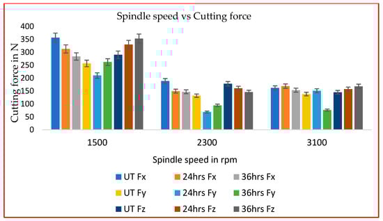 The effects of the spindle speed on the feed force (Fx), normal force (Fy) and axial force (Fz) under all machining conditions are shown in Figure 4 with a constant feed rate of 0.1 mm/min. It was noted that the workpiece and cutting tools were initially quite rigid and the cutting force acquired maximum impact at lower cutting parameters. It caused milling machines to need greater torque power to shear the workpiece material at low spindle speeds (S) and feed rates (Vf). The feed force (Fx), was reduced by 12% and 20% for 24-h and 36-h cryo-treated cutting inserts, respectively, compared to UT. Normal force and axial force were slightly increased at low spindle speeds. After increasing the spindle speed from 1500 to 2300 rpm, the axial force (Fz) dropped by 9% when using 24-h CT and by 28% when using 36-h CT inserts, whereas the feed force (Fx) decreased by 20% when using 24-h CT and by 22% when using 36-h CT inserts. The normal force (Fy) decreased by 48% when using 24-h CT and by 28% when using 36-h CT inserts compared to UT cutting inserts. A lower cutting force was obtained in all directions by using cryo-treated cutting inserts. With the exception of the 36-h cryo-treated insert, which saw a 5% and 44% reduced cutting force compared to UT and 24-h CT inserts, respectively. Increasing the spindle speed typically caused a reduction in the cutting force. The impact of cryogenic treatment on the cutting force at a spindle speed of 3100 rpm, a feed rate of 0.1 mm per revolution and a cut depth of 0.5 mm is shown in Figure 5; the three forces are the Fx, Fy and Fz at various speeds.