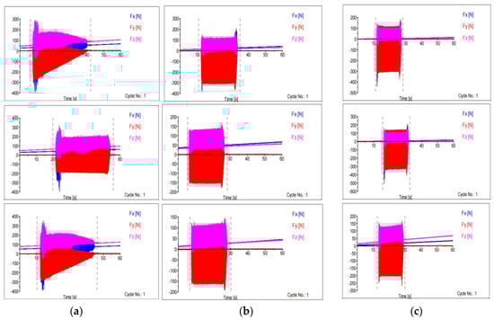 Cutting force at various speeds: (a) 1500 rpm (b) 2300 rpm (c) 3100 rpm.