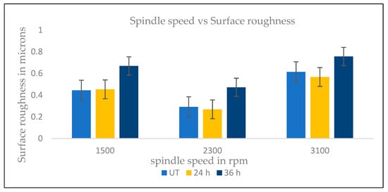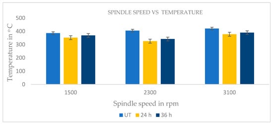 The cutting temperature (Tc) in the workpiece–tool interface area (rake) was measured using a noncontact type IR thermometer with an accuracy of ±1.0 °C. By carefully focusing an IR ray on the cutting zone during milling and noting the greatest temperature reached, a tool–workpiece interface and heat were created. Due to friction between the tool and the workpiece, the cutting temperature was detected. Higher cutting temperatures result in less cutting force since the material may be deformed with less force. Due to the increasing shear stress, the workpiece became softer and required less cutting power to shear the material. Consequently, higher spindle speeds generated more heat in the cutting zone, shortened the tool–workpiece contact time and raised the shear plane angle [32]. When using 24-h cryo-treated cutting tool inserts, the cutting zone temperature was 5–6% less than the UT and 36-h cryo-treated cutting insert. This was proved by the cutting zone temperature at various spindle speeds and consistent feed rates (0.1 mm/min) as shown in Figure 6.
