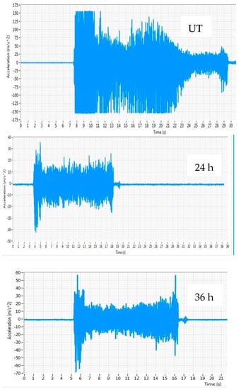 Figure 7 shows the vibration of UT and cryo-treated cutting inserts. As the amount of friction between the workpiece and the UT cutting tool grew, the Tc also rose, leading to wear on the cutting edge. Using the 24-h cryo-treated cutting inserts resulted in lower friction due to the cutting zone temperature compared to the 36-h and UT inserts, as shown in Figure 6. The vibration is also one of the factors for tool wear. From the observed vibration, cryogenically treated inserts offer good strength and generate less vibration, resulting in superior surface finishes because of their exceptional rigidity and minimum tool wear even at higher spindle speeds, which the wear morphology SEM picture demonstrates. Cryo-treated cutting tool performance is better than that of the UT cutting inserts.