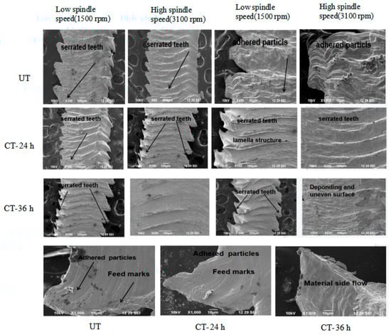 Figure 10 shows the SEM image of chip anatomy after milling at different spindle speeds (1500, 2300 and 3100 rpm), a feed rate of 0.1 mm/min at a constant depth of cut of 0.5 mm. It is clear that the teeth were produced as serrated teeth after milling and have shrunk as a consequence of cryogenic treatment. When feed and cutting were maintained constantly, there appeared to be a rising trend in the chip segmentation frequency along with an increase in the cutting velocity. However, when machining was performed quickly, there was little time for chips to deform, making it impossible to effectively dissipate the cutting heat, which led to adiabatic shearing and then chip breakage. Vibration affects tool abrasion. Therefore, increased chip thickness in the UT cutting inserts may be seen as a result of vibration. The expansion of the shear plane area led to an increase in the chip thickness. As a result, as the spindle speed increased, the cutting force also increased, promoting the production of periodic chips and raising the chip thickness. An increase in Tc and high heat loads caused plastic deformation on the chips, as shown in Figure 10. Machining at high-temperature regions became easier due to thermal softening. A more significant number of serrated teeth can be seen on both sides of the untreated inserts at a high spindle speed (spindle speed (S) of 3100 rpm and feed rate of Vf 0.1 mm/min). When the material was removed at high temperatures, shear marks appeared and the chips were more deeply serrated because of the friction on the workpiece, and the chip particles adhered as shown in Figure 10. These tools had different chip lengths and twists in contrast to those under cryo-treated circumstances. The lengthier chips were a result of the intense friction that produced excessive heat during material cutting at a low feed rate and spindle speed, as well as the chips being stuck together [36,37].
