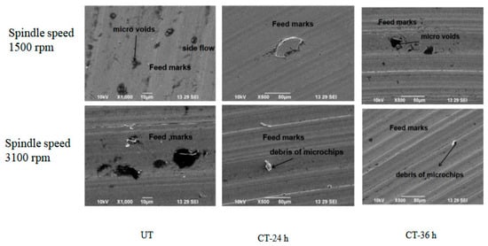 High local cutting temperatures generated by fast cutting can cause pitting corrosion on the torn surface. Tool–workpiece interfaces formed melting layers and surface layers underwent phase transformation, leaving oxides and metal debris adherent to the machined surface at a high spindle speed (3100 rpm, UT), as shown in Figure 10. The way a burr forms during machining can be used to determine the type of burr and the mechanism of its production. A material will swell at the sides when compressed until it experiences plastic deformation. A 36-h cryo-treated and UT cutting tool used at the same spindle speed after machining a workpiece produced high depths of feed marks, debris and microvoids compared to a 24-h cryo-treated cutting tool [39]. Figure 10 shows that the 24-h cryo-treated cutting tool performed better than the 36-h cryo-treated inserts.