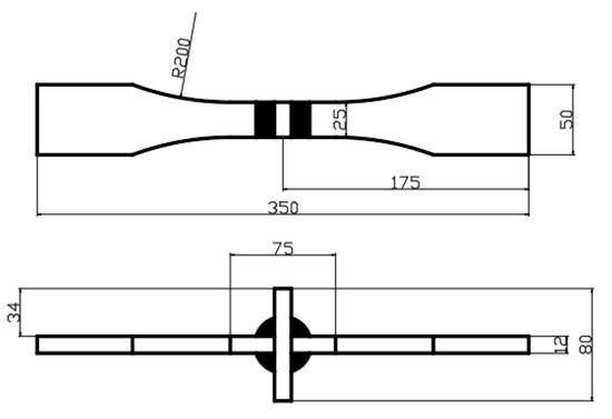 The test material selected was flow-alloy weathering steel SMA490BW plate, and its chemical composition is presented in Table 1. The conventional mechanical property test results are presented in Table 2. The original steel plate size used for welded joints measured 300 mm × 150 mm × 12 mm. Furthermore, the MAG melting welding method was used to fabricate the welded joints, with a shielding gas of 80% Ar + 20% CO2 and CHW55-CNH welded wire with a diameter of 1.6 mm. After welding was completed, sampling was carried out, and the original fatigue test specimen is shown in Figure 1. The overall fatigue test specimens of the welded joint were conducted in accordance with the method of axial loading fatigue test of metal materials specified in HB5287-1996.
