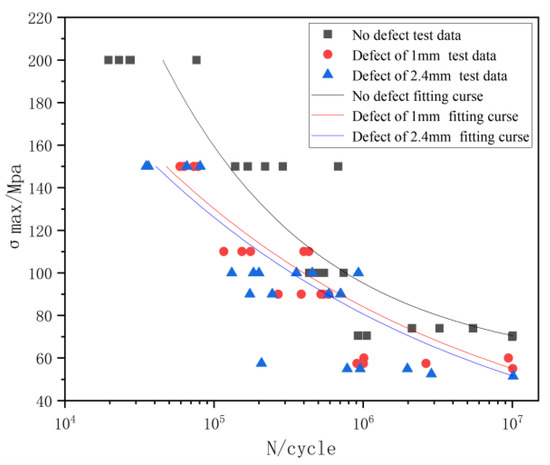 From Figure 3, at R = −1, the defect-free curve was at the top, followed by the curve with a defect size of 1 mm, with that of 2.4 mm at the bottom. The fatigue limits of the 1 and 2.4 mm defect specimens were 57.2 and 53.7 Mpa, respectively. Thus, the fatigue limit of the 1 mm defect specimen was 6.1% higher than that of 2.4 mm defect specimen. However, compared with the 70.9 Mpa welded non-defective specimen, the fatigue limits of the 1 and 2.4 mm defect specimens were reduced by 18.9% and 23.9%, respectively. This shows that within 80% of the minimum penetration, different defect sizes have minimal effect on the fatigue limit of welding; however, the existence of defects significantly reduces the fatigue limit of the specimen.