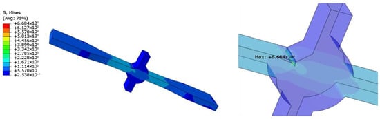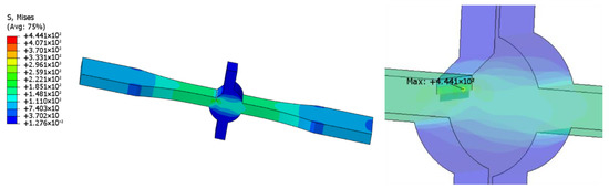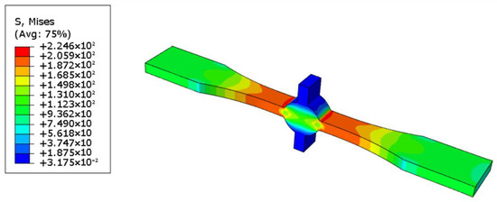 To eliminate the influence of defects on the stress concentration at the weld toes, we established a defect-free model, and the calculation result is shown in Figure 6. Herein, the stress concentration coefficient at the weld toes was 2.246. The calculation results of samples containing 1 and 2.4 mm defects are shown in Figure 7 and Figure 8, and the stress concentration coefficients at the defects were 4.441 and 6.684, respectively; that is an increase of 98 and 198% compared with the non-defective samples.