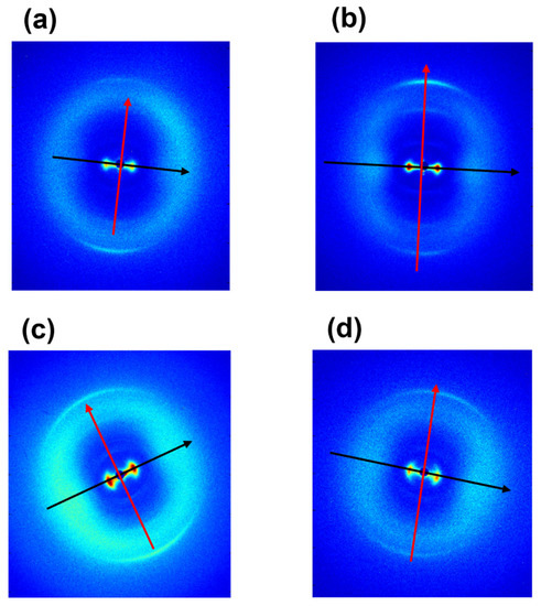 Two-dimensional WAXS diffraction patterns of equine extensor (a), bovine (b), ovine (c) and porcine (d) tendons. The equatorial and meridional directions are marked with black and red arrow, respectively.