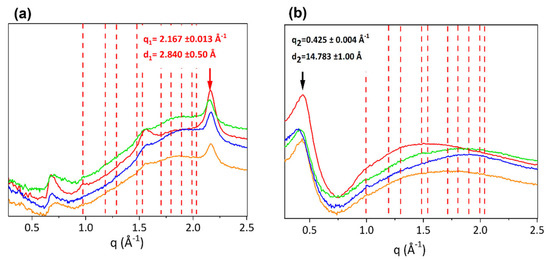 The peak along the meridional direction (Figure 2a) at q1 = 2.167 ± 0.013 Å−1, corresponding to d1 = 2.84 ± 0.50 Å, is the distance among two close amino acid residues along the axis of the triple helix (axial turn). The major peak along the equatorial direction (Figure 2b), identified at q2 = 0.425 ± 0.004 Å−1 corresponding to a d distance of about d2 = 14.78 ± 0.150 Å, refers to the lateral packing distance between collagen molecules.