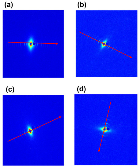 Two-dimensional SAXS diffraction patterns of equine extensor (a), bovine (b), ovine (c) and porcine (d) tendons. The meridional direction is marked by a red arrow.