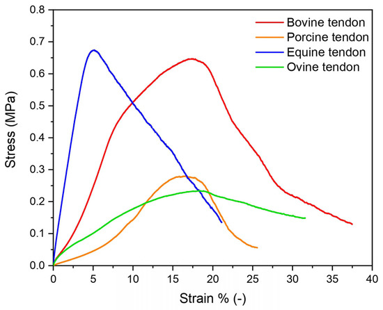 Tendons’ mechanical response depends on their highly organized hierarchical structure that reflects their micro- and nano-organization. To investigate tendons’ structural properties on the macroscopic level, the mechanical response of all of them was evaluated by means of a tensile test. Figure 6 shows the stress–strain curves of equine (blue), bovine (red), porcine (orange) and ovine (green) tendons. The equine extensor tendons were revealed to have the highest E modulus, followed by bovine, ovine and porcine tendons (Table 3), reflecting the different natural load-bearing capacities. As known, mechanical behavior reflects the motor habits of these animals. Thus, equine tendons were much stiffer than those of other animals as they must support the horse’s leg movements during fast running, in addition to the fact that they have to support the weight of a large-size animal. Similarly, tendons of cattle, which move less than horses but are still large-size animals, had a high modulus. Next were tendons of ovine, which are much smaller in size than horses and bovines and therefore need more support at a lower load. Finally, pigs are characterized by the lowest modulus. Similarly, the maximum stress registered was similar for equine and bovine and was found to be three times higher than that of porcine and ovine tendons. Very different values were registered compared to those found in literature, due to the different preconditioning and strain rates applied in this study from other literature [31]. Tendons had a viscoelastic behavior for which a strong test parameter dependence exists: an increase in the stress and strain at failure was registered with a strain rate increase [32,33]. Moreover, it should be mentioned that tendon properties are strongly dependent not only on animal type but also on age, sex, site, feeding, living condition and general health status.